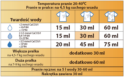 Sposób stosowania: priorytetowo należy przestrzegać wskazówek dotyczących pielęgnacji wyrobów z wełny podanych na metce przez producenta, szczególnie należy stosować się do ograniczeń temperatury prania. Prać wyroby trwale farbowane i przeznaczone do prania na mokro. Pranie w pralce bębnowej: prać w programie przeznaczonym do wełny. Ustaloną w tabeli ilość płynu wlać do zasobnika w pralce. Nie korzystać z programów suszenia. Pranie ręczne: ustaloną w tabeli ilość płynu wlać do wody o odpowiedniej temperaturze i wymieszać. Wyroby wełniane zanurzyć w wodzie i pozostawić do nasączenia. Wypłukać po praniu. Pranie i płukanie wykonywać przez ugniatanie i odwracanie. Nasączone wyroby unosić w zwartej całości, unikać rozciągania. Suszenie: odsączyć z wody wygniatając, nie wyżymać, nie wirować. Suszyć na płasko, unikać bezpośredniego słońca. Do dosuszenia w pozycji wiszącej można przejść, gdy wyroby będą lekkie, pozbawione wody. Nie suszyć w suszarkach bębnowych.